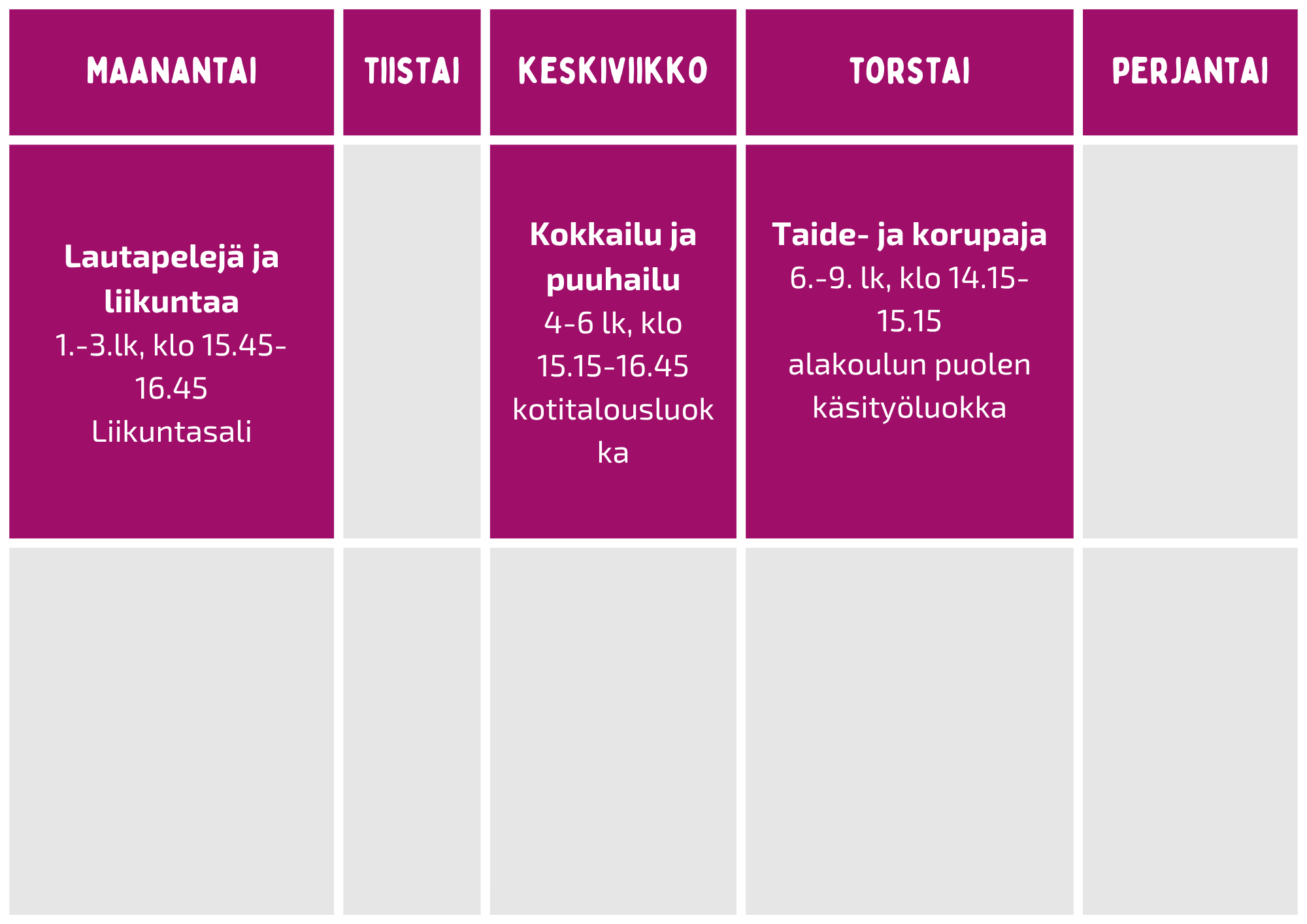 Harrastukset järjestetään koululla tai sen välittömässä läheisyydessä, joten toimintaan on helppo tulla mukaan.